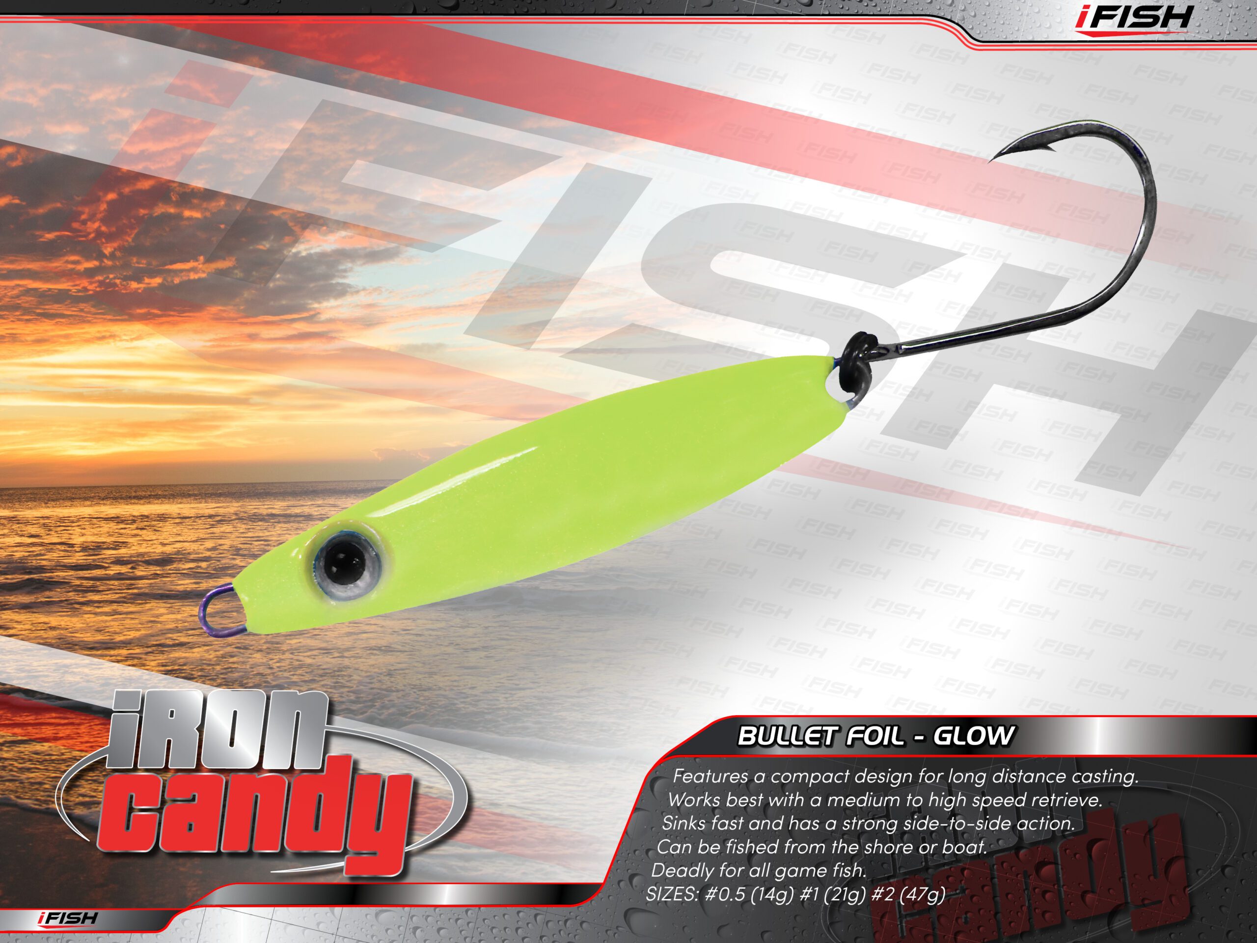 Sinks fast and has a strong side-to-side action. Can be fished from the shore or boat. Deadly for all game fish.