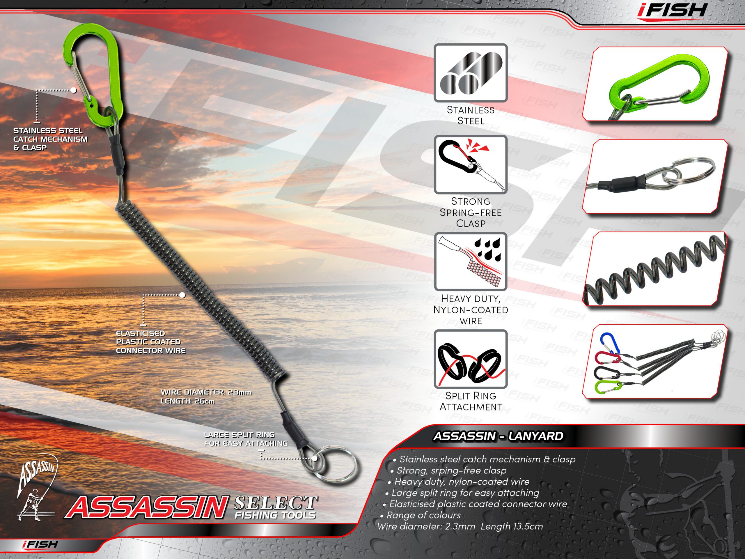 • Stainless steel catch mechanism & clasp • Strong, srping-free clasp • Heavy duty, nylon-coated wire • Large split ring for easy attaching • Elasticised plastic coated connector wire • Range of colours